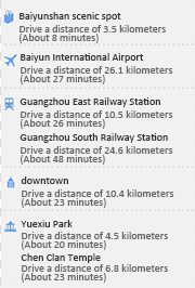 ------Bus: Bus No. 63 passes through Baiyun Mountain scenic area、Luhu Park、 Friendship Store、 Dongshan; Bus No. 268 passes through Chen Clan Academy Chen's Ancestral Hall、 Shangxiajiu Pedestrian Street、Liwan house; Bus No. 58 passes through Guangxiao temple、 Six Banyan Temple、 Shishi Cathedral、 Aiqun Mansion、 Shamian scenic area、the Pearl River; Bus No. 810/810A passes through GuangZhou East Railway Station、 Zhujiang New Town、 Tianhe City、TaiKoo Hui、 Computer City.
